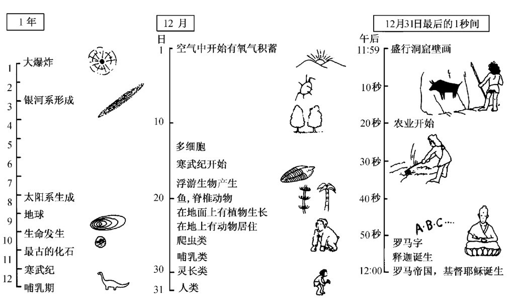 本节结束前,把一幅宇宙“日历”提供给读者,让大家更能清楚我们在时间发展中的位置(图1.12)。