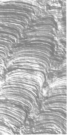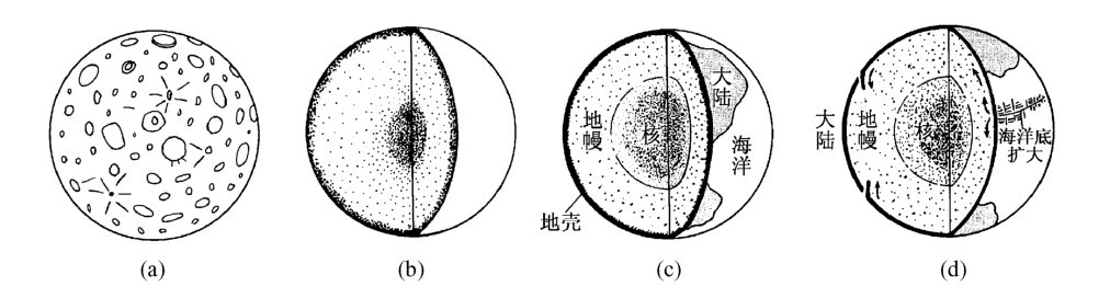 风雨侵蚀是造成地壳形状,使之平面化的破坏性力量。如果没有其他力量起作用,世界就全是平坦的了,因为高山和丘陵会早就在几百万年里清除掉了。但是,还有建设性的力量在起作用,它缓慢而不断地改变着地壳。地球内部由于负担外层的全部重量,经受很高的压力。这种压力有时在一处消除,或在另一处增强。压力的变化引起地壳上下运动,造成高原和深洼地,有时地壳作横向运动,地壳褶皱起来,造成山脊和峡谷,就像把一幅布从两头往中间推时,布就褶皱起来一样。山的形成和随后的侵蚀是不断地相互作用的。我们生活的时代和一个十分剧烈的山脉形成的时代相隔只有几百万年,这就是为什么地壳现在呈现出这么多不同山脉的缘故。从现在起大约5千万年以后,如果在此期间不发生新的形成山脉的事件的话,地球可以变得平坦得多,也就不像现在这么有趣。图1.9为地球的演化过程示意图。