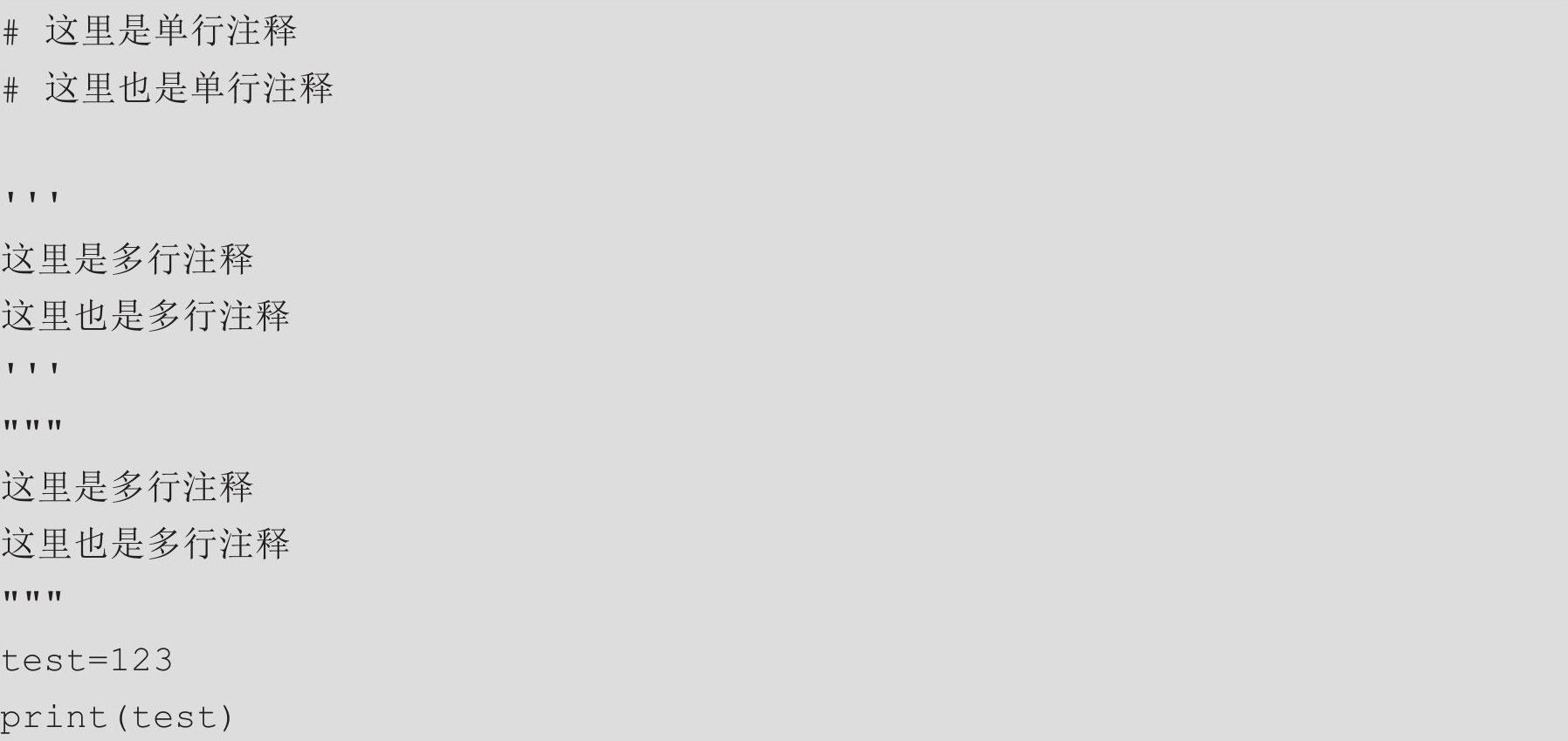 当注释内容超过一行时,可以在每行开头都使用“#”形成多行注释,还可以使用“'''”(连续3个英文半角单引号)或“"""”(连续3个英文半角双引号)将多行注释内容包括起来,示例如下。