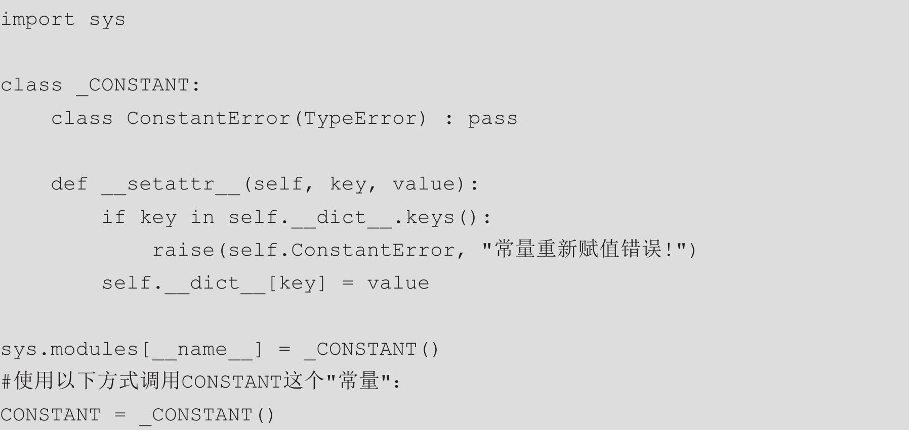 与C、C++、Java、C#等语言不同,Python没有定义常量的关键字,即Python中没有常量。为了实现与其他语言中功能相近的常量,可以使用面向对象的方法编写一个“常量”模块。