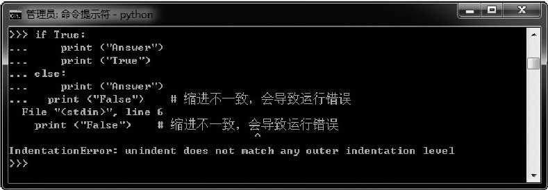 而以下代码由于最后一行语句缩进距离不一致,运行时将出现图3-3所示的错误。
