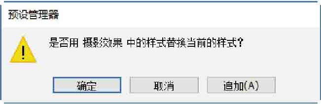 Step03 选择样式添加方式。经过上步操作,弹出如图2-86所示的提示框,选择添加样式的方式,单击【确定】按钮,表示选择的样式库替换当前的样式;单击【追加】按钮,表示将选择的样式库追加到当前样式列表中。