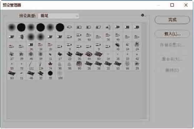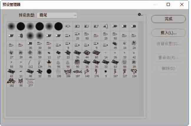 Step02 选择要添加的外部样式文件。在【载入】对话框中,找到外部资源库文件的存储位置,并选择要载入的资源库文件,单击【载入】按钮,返回【预设管理器】窗口,单击【完成】按钮,如图2-88和图2-89所示。