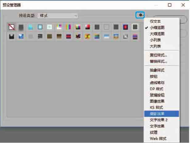 设置【样式】预设。单击【预设类型】下拉列表,选择要设置的资源库类型,如【样式】,单击窗口右上角的【设置】按钮