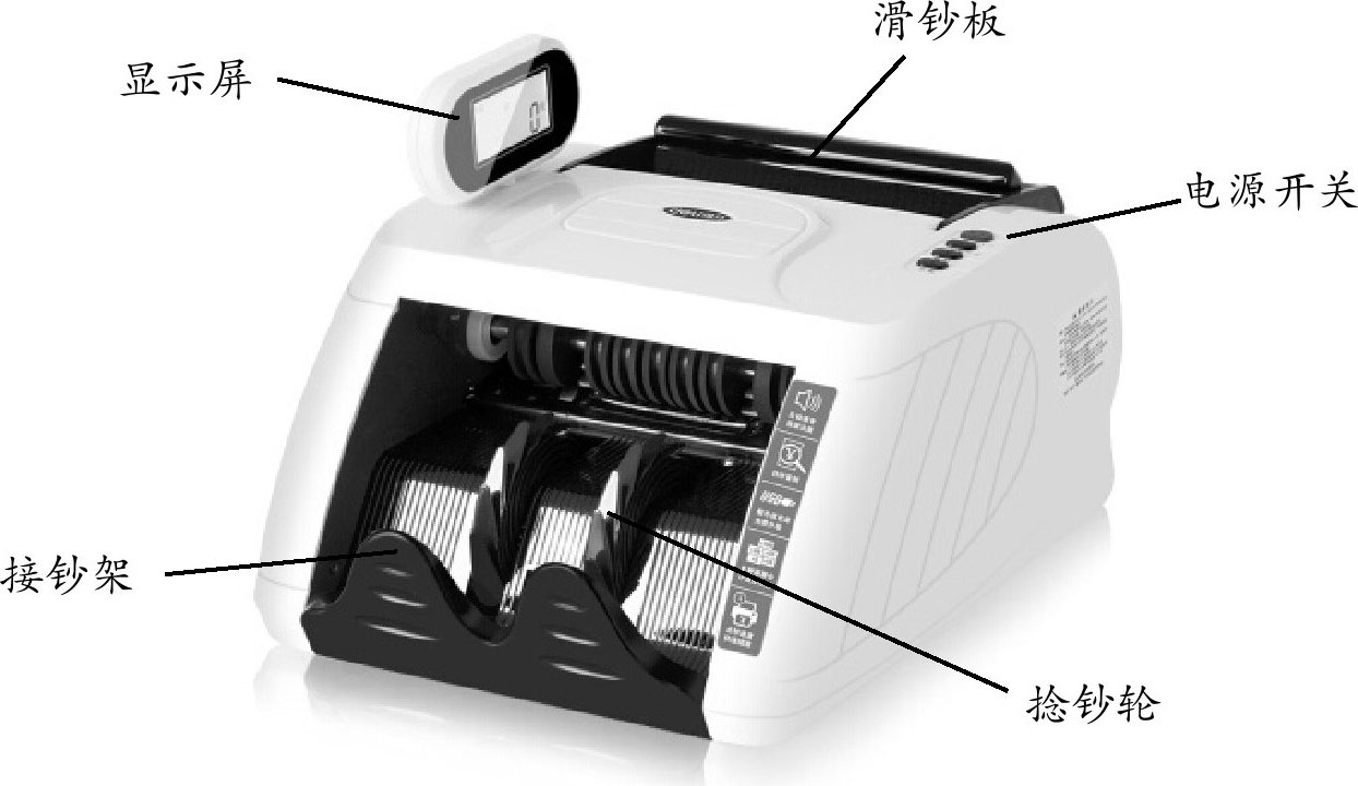 点钞机是一种自动清点钞票数目的机电设备。一般应至少具备两个功能:计数功能和验钞功能。在验钞功能方面,点钞机必须具备“磁性检伪、紫光检伪、数码综合检伪”三重检测标准,才能更加精准地辨别钞票的真伪。点钞机最初只在银行等大型金融机构应用,随着技术不断成熟,成本不断降低,如今普通点钞机已经被广泛运用于企业,成为企业财务部门不可缺少的日常办公用品。普通点钞机机型如图2-3所示。
