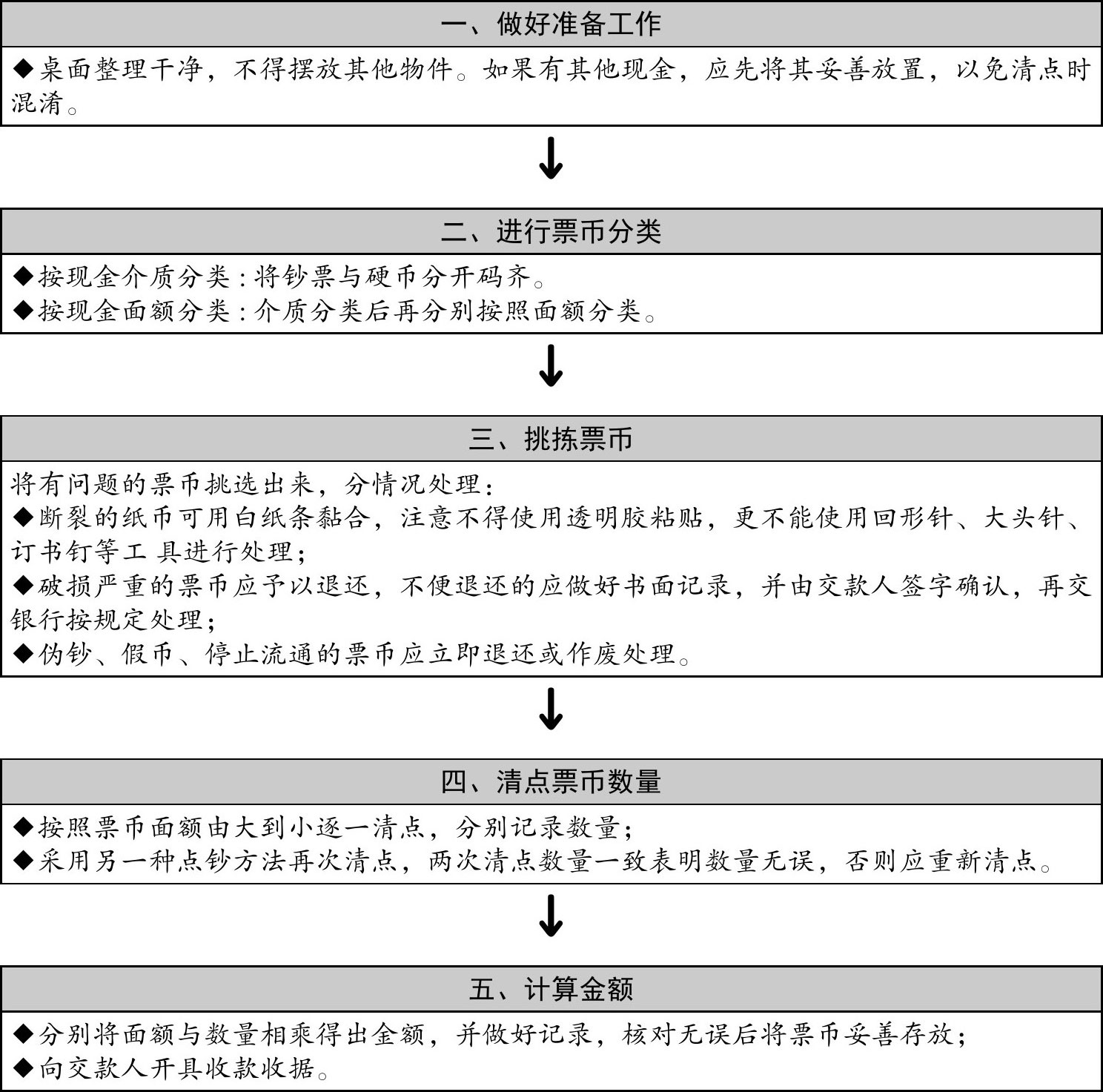 点钞基本流程主要包括以下几个步骤:做好准备工作、进行票币分类、挑拣票币、清点票币数量、计算金额。同时,在进行每一步骤时还应注意一些细节上的问题,具体步骤及注意事项如图2-2所示。