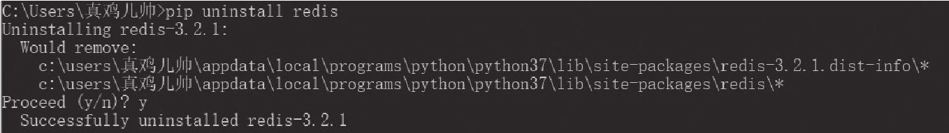 如果需要卸载之前安装的模块,输入pip uninstall模块名,就可以卸载相应的模块了,如图3-7、图3-8和图3-9所示。