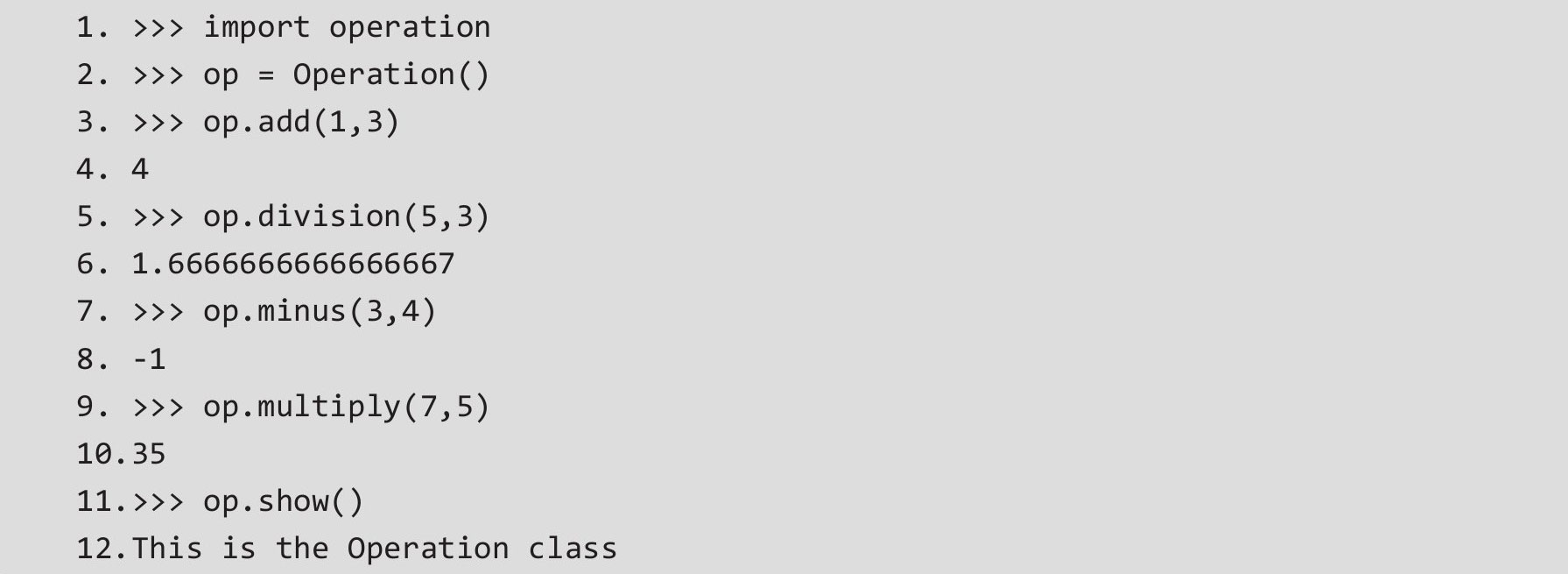 把上面的类写入一个模块内,命名为operation.py,然后在控制台调用它,示例代码如下。