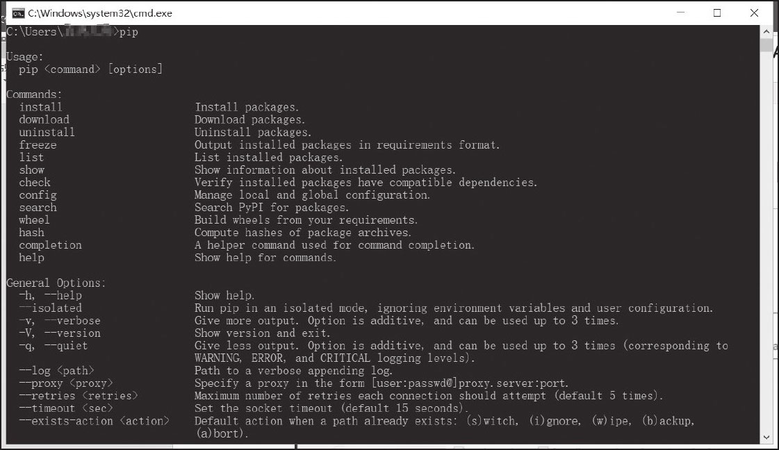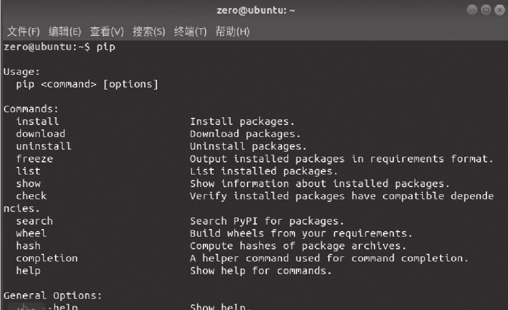 而对于Linux用户,可以直接在终端中输入“sudo apt install python-pip”,然后等待下载完成安装即可。接着可以在终端中输入“pip”查看是否成功安装,如图3-4所示。
