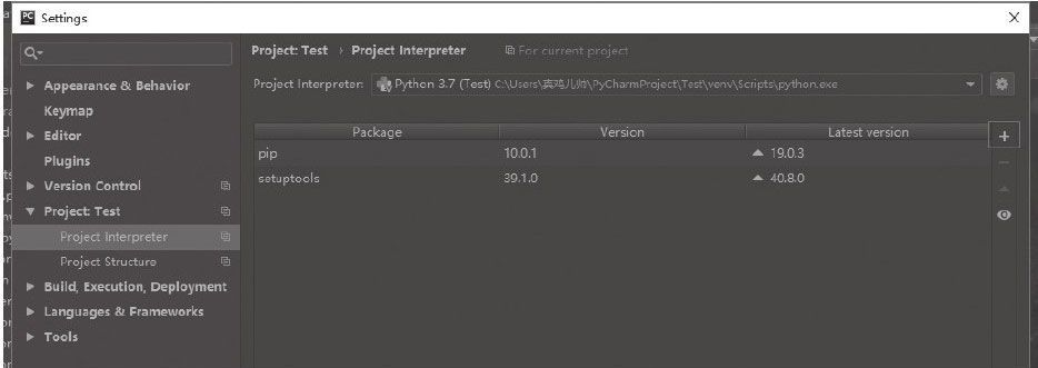如果是使用PyCharm,则可以选择【File】→【Setting】→【Project:Test】→【Project Interpreter】选项,在打开的界面中进行模块的安装和管理,如图3-10所示。