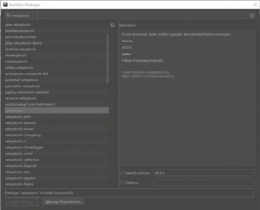在搜索完成后,单击【Install Package】按钮即可开始安装模块。如果模块安装成功便会出现图中绿条,显示安装成功。