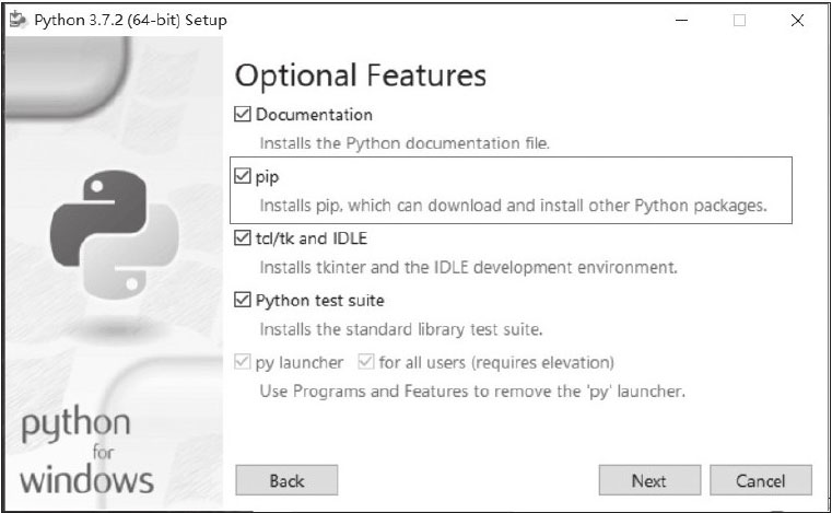 pip是一个Python包管理工具,可以安装PyPI的软件包,是在使用Python时必不可少的工具。要使用pip安装的话,首先需要先安装pip。对于Windows用户,可以直接在Python的官网中下载安装Python,然后选中“Add Python”复选框,而pip会在这个过程中同时设置好,如图3-1和图3-2所示。