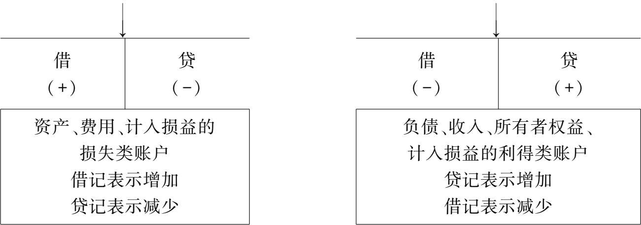 在复式记账法中,通过在某个账户的借方或贷方记录某一金额——用会计术语描述就是借记或贷记某个账户,来表示该账户金额的增加或减少。具体记录规则如下:扩展会计恒等式左边的资产类、费用类及计入损益的损失类账户的借方记录金额(借记)表示账户金额增加,贷方记录金额(贷记)表示账户金额减少;扩展会计恒等式右边的负债类、所有者权益类、收入类、计入损益的利得类账户的贷方记录金额(贷记)表示账户金额增加,借方记录金额(借记)表示账户金额减少。