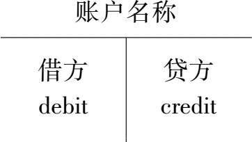 为了更加详细、具体地反映企业的经营成果和财务状况,财务会计对基本会计要素做出进一步分类,形成了若干个账户。例如,资产要素按照类别细分为银行存款账户、应收账款账户、固定资产账户等。传统的账户形状类似一个大写的英文字母“T”,习惯上被称为T型账户。T型账户的左边与右边最初被定义为威尼斯方言dare、avere,后经帕乔利修改为debito、credito,英国学者欧文将其进一步简化为debit、credit,日本学者福泽谕吉在译著《账合之法》中将debit、credit翻译成“借”“贷”。此后,中国会计界先驱、知名会计学者谢霖和孟森将“借”“贷”的译法引入中国。此处的“借”与“贷”没有任何经济含义,仅仅是账户左右两边的名称而已。T型账户表示如下: