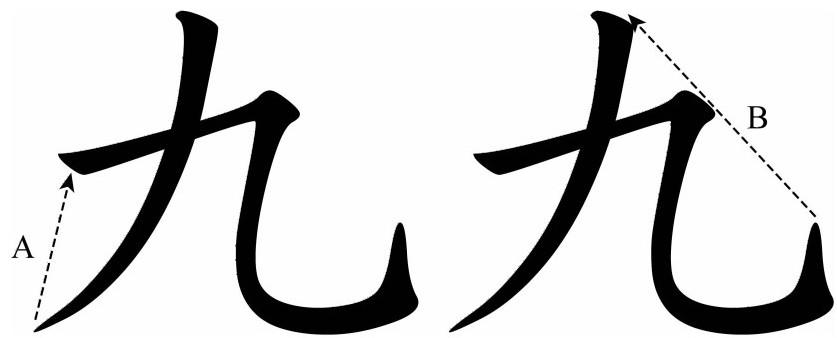 笔顺就是一个字中笔画的书写顺序。“笔顺安排得合理,有助于正确地书写汉字(防止漏写笔画),有助于匀称地书写汉字(把字写得紧凑、美观),有助于快速地书写汉字(上一笔接写下一笔时,走笔的过程最短,转换最顺手)。”(高家莺,范可育,费锦昌《现代汉字学》,高等教育出版社,1993年版,第43页)比如“九”字,在不改变笔画的长度和位置的情况下,先写撇比先写横折弯钩走的过程短,所以要先写撇,后写横折弯钩。如下图所示,两个“九”字完全相同。如果先写撇,除了笔画自身之外,走笔的路程为虚线A;如果先写横折弯钩,除了笔画自身之外,走笔的路程则为虚线B。很明显,虚线A比虚线B短得多。按照第一种笔顺书写路程更短,速度自然会快。
