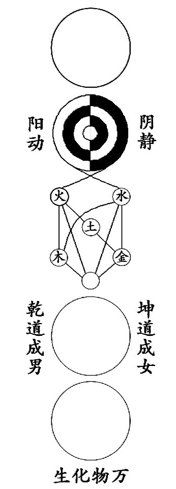 无极而太极。太极动而生阳,动极而静,静而生阴。静极复动。一动一静,互为其根;分阴分阳,两仪立焉。阳变阴合,而生水、火、木、金、土。五气顺布,四时行焉。五行,一阴阳也;阴阳,一太极也;太极本无极也。五行之生也,各一其性。无极之真,二五之精,妙合而凝。“乾道成男,坤道成女”,二气交感,化生万物。万物生生,而变化无穷焉。