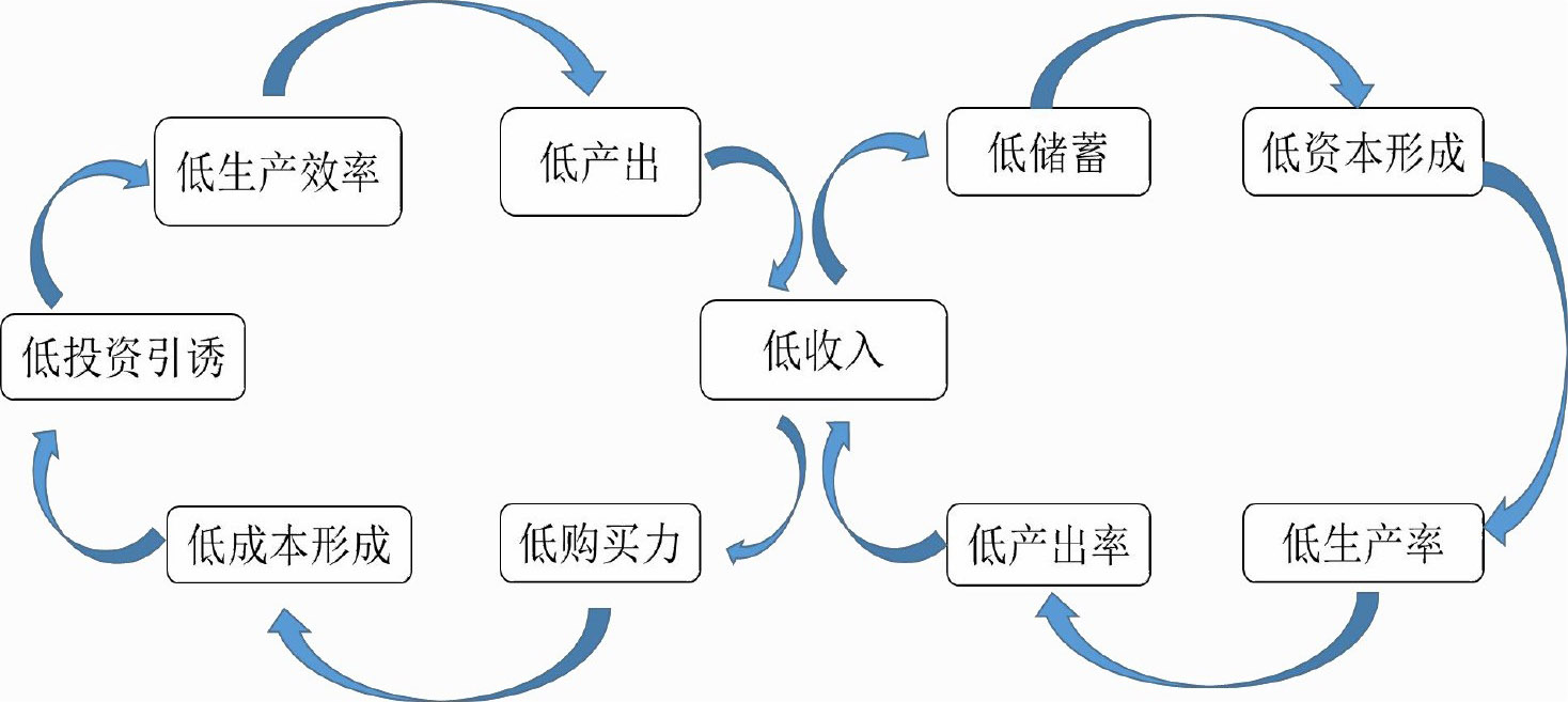 从经济学理论出发,按照生产的投入和产出角度分析贫困成因可以概括为贫困的恶性循环理论。这一理论体系起源于美国经济学家罗格纳·纳克斯于1953年在其所著的发展经济学经典代表作之一《Pro blems of Capital Formation in Underdeveloped Countries》一书中提出的关于资本与经济发展关系的理论。持这一观点的学者认为,发展中国家长期陷入贫困是由于一连串的、较低的投入-产出行为造成的。从供给方面看,资本形成有一个恶性循环。发展中国家经济不发达,人均收入水平低,低收入意味着人们不得不把大部分收入用于生活消费,而又很少用于储蓄,从而导致了储蓄水平低、储蓄能力低;低储蓄能力会造成资本形成不足,资本形成不足又会导致生产规模难以扩大,生产效率难以提高;低生产率造成低产出,低产出又造成低收入。周而复始,形成“低收入—低储蓄—低资本形成—低生产率—低产出—低收入”的恶性循环。从需求方面来看,资本形成同样也形成一个恶性循环。发展中国家经济落后,人均收入水平低下,这就意味着较低的购买力和消费能力;低购买力导致投资引诱不足;投资引诱不足又会造成资本形成不足;资本形成不足又会使得生产规模难以扩大,生产率难以提高;低生产率又带来低产出和低收入水平。这样,形成“低收入—低购买力—低投资引诱—低资本形成—低生产效率—低产出—低收入”恶性循环。所以,贫困导致投资不足,投资不足导致低产出,低产出导致低收入,如此循环,这就是发展中国家贫困再生产的过程和机制。(如图1-1)