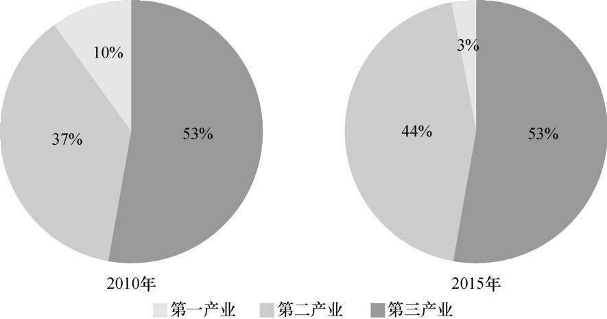 图1-1 2010、2015年成都市三类产业生产总值占比情况