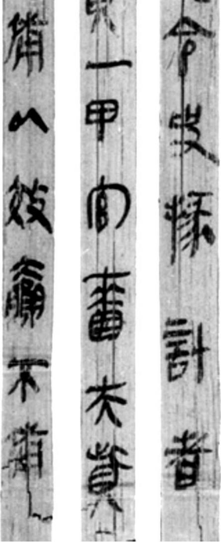 1979年,四川省青川郝家坪50号墓出土了秦地《青川郝家坪木牍》(图2-18),为战国晚期秦武王二年至四年(前309年—前307年)的手迹,被视为目前可见的年代最早的古隶,即隶书的早期形态。如其中的“月”“己酉”“三”等字,与同时期的篆书写法不一样,是隶书的写法。