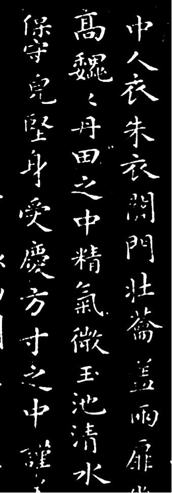 楷书发展到王羲之、王献之,便与我们对楷书的惯常印象基本吻合了。下面三幅楷书,左边是钟繇的《贺捷表》(图2-32),中间是王羲之的《黄庭经》(图2-33),右边是王献之的《洛神赋》(图2-34)。跟王羲之相比,王献之更媚一些,钟繇更加质朴一些,而王羲之则在中间起着一个承上启下的作用。早期的楷书显得质朴无华,越往后越妍美秀媚。“古质而今妍”,尽管质朴听起来好像很不错,但一般大众还是比较喜欢妍美。我们今天对楷书的审美和认知,在很大程度上也是由“二王”(王羲之、王献之)的时代建立的。