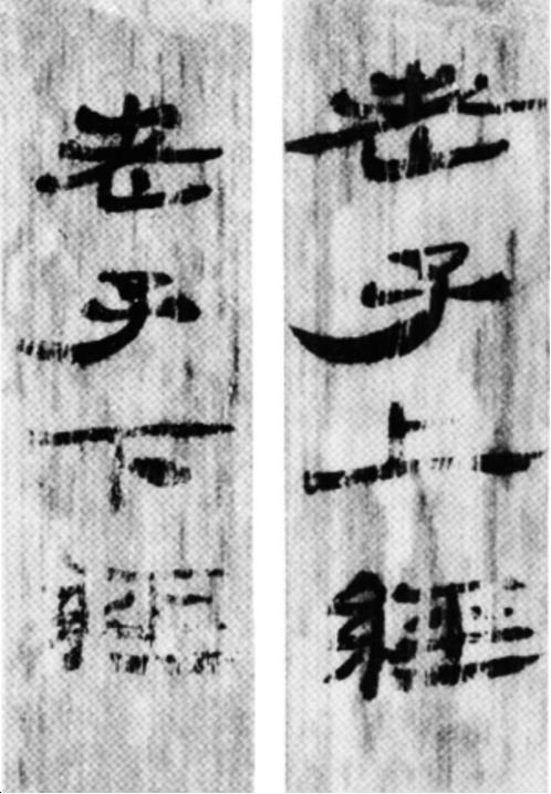《马王堆帛书》(图2-23)是西汉早期的隶书,写在帛上而字形犹有篆意。北京大学图书馆藏的西汉中期竹书《老子》(图2-24),隶书的主要特征--横平竖直的字势和“翘檐式”的捺尾也已成熟,很见飘逸飞动之势。