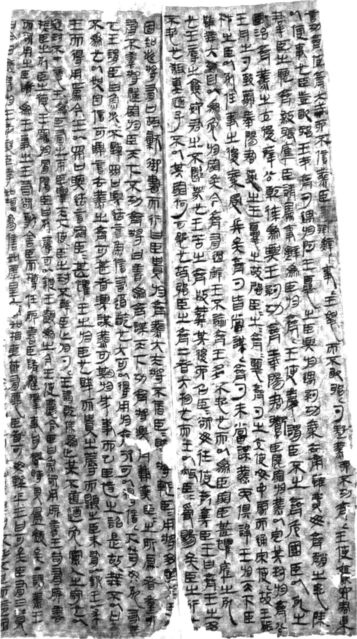 1975年湖北发掘出土的《云梦睡虎地秦简》(图2-19),是战国晚期至秦统一初期的文字,从字形特征看,也属于“古隶”。