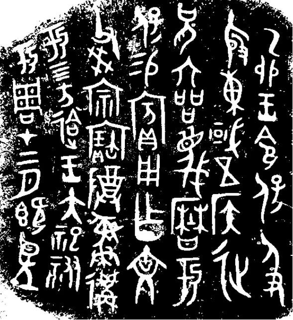 下面是西周的《保卣》铭文。保卣是一种用于盛酒的酒器,盖(图2-9)和器(图2-10)上都铸造了文字。许多字的写法跟我们现在很相似,例如开头的“乙卯”两个字。其后出现的“王”“令”“保”三个字,也与今天的字大体相似。器上的文字内容和盖上是一致的,字口是凹陷的阴文,把它们分别用宣纸拓出来,就成了黑底白字的拓片了。