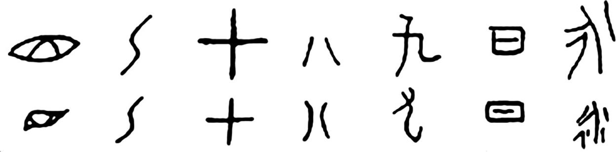 在商代成熟的甲骨文之前,汉字也曾经历过一个图跟文混用的阶段。所以,甲骨文并不是无源之水,是传承有序的。例如在河南舞阳县贾湖新石器遗址发现的符号(图1-4,第一行),距今约7000—8000年,比殷墟甲骨文(第二行)早了3000多年。对比殷墟甲骨文,可以看出其中的相似性和延续性。