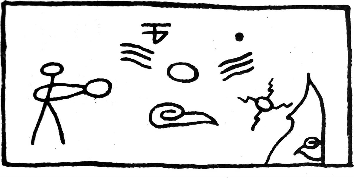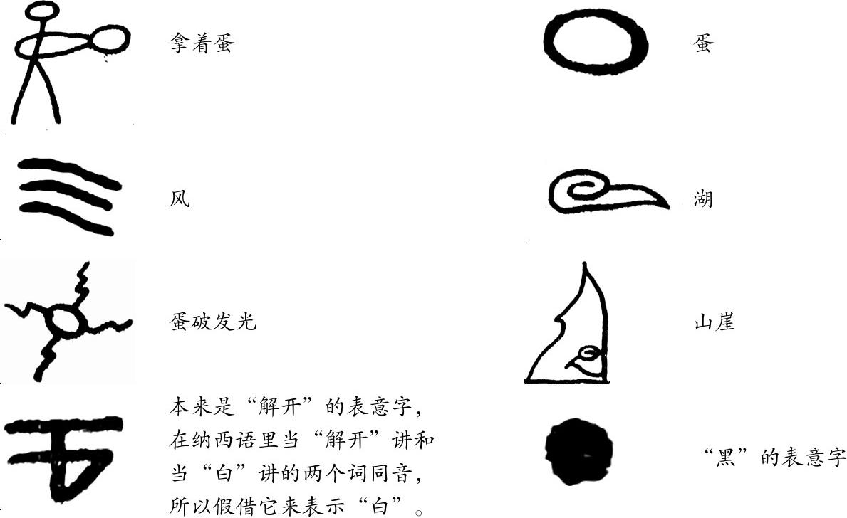 文字学家裘锡圭先生则认为:“在文字发生的原始阶段,文字和图画大概是长期混用的。”裘先生还以云南丽江纳西族的原始文字为例,说明这个文字和图画的混用阶段。(《文字学概要》)纳西族的《古事记》里有这样一段文字(图1-2),你能看出来是什么意思吗?
