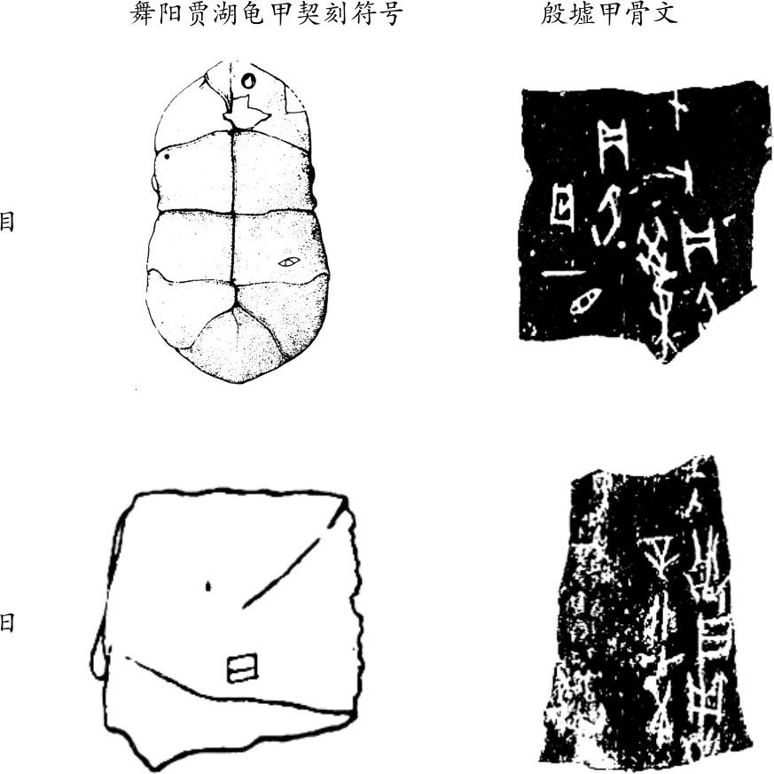 图1-5 舞阳贾湖龟甲契刻符号与殷墟甲骨文比较