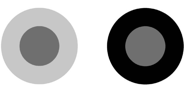你会明显地感觉到,图中两个圆中间的灰度区域看上去彼此有很大的不同,左边的更黑一些,右边的更淡一些。可是,它们的灰度实际上是一样的。你可以用很简单的方法来验证一下。请把一张纸卷成一个细长筒,确保你的眼睛只能看到中间的灰色区域,把长筒先对着左边的图中央,然后再对着右边的图中央,你就会发现两副图中央的灰度是一样的,这个现象是不是很奇妙?这实际上是由于中间颜色与背景颜色的对比使我们产生了错觉。