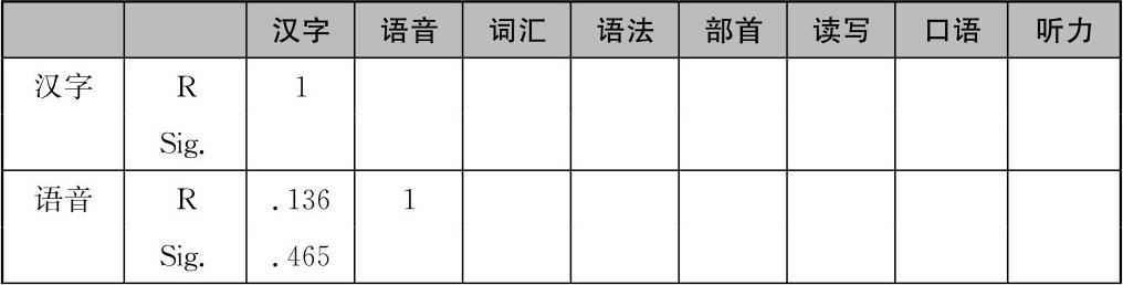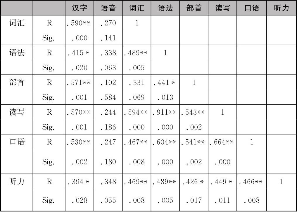 表4-6 学生汉字习得与各语言要素、语言能力习得情况的简单相关分析