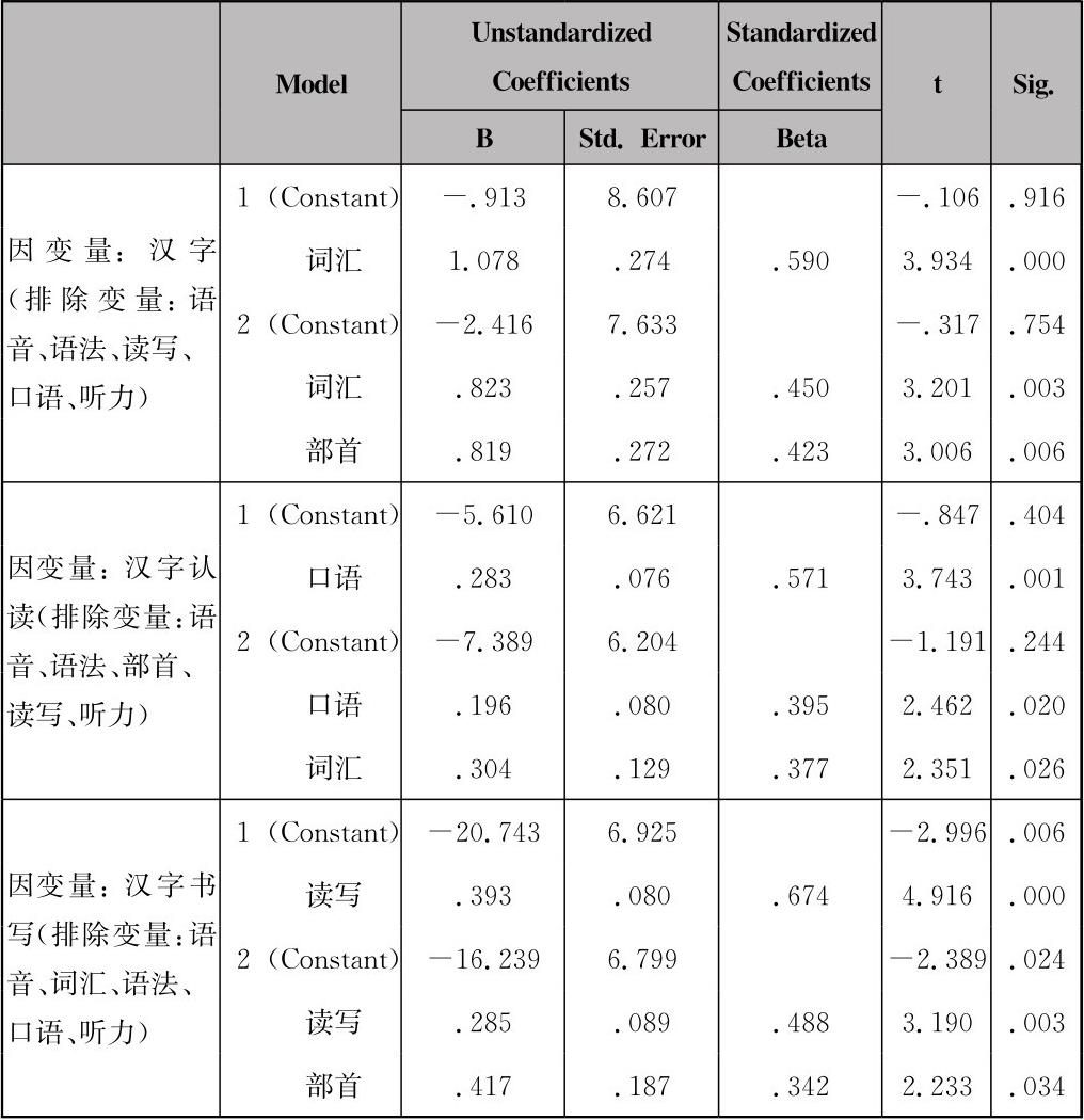 可以看到,学生的汉字习得情况与除语音习得情况之外的其他六大要素都存在着一定程度的简单(正)相关关系。但同时也可以看到,事实上,除了语音这个要素较为独立之外,其他被检验的7个变量两两之间也大多存在着相关关系(把汉字认读情况、汉字书写情况作为变量1进行检验,也得到类似结果,限于篇幅,此处略去)。如果把语言学习作为一个互动整体来看待,出现这样的现象是正常而且是必然的,但作为汉字习得与其他因素的相关性研究,这样的结果显然意义不大。因此,有必要引入多元回归分析,来检验在上述7大要素中,与汉字习得情况存在实质相关的变量。与前面一样,我们分别将总体汉字习得情况、汉字认读、汉字书写作为因变量,将其他7个变量作为自变量,进行多元线性回归分析,在变量选择时采用逐步(stepwise)法,得到如表4-7所示的3组结果:
