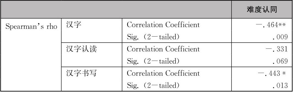 表4-5 学生对汉字学习难度的认同与汉字习得的相关分析