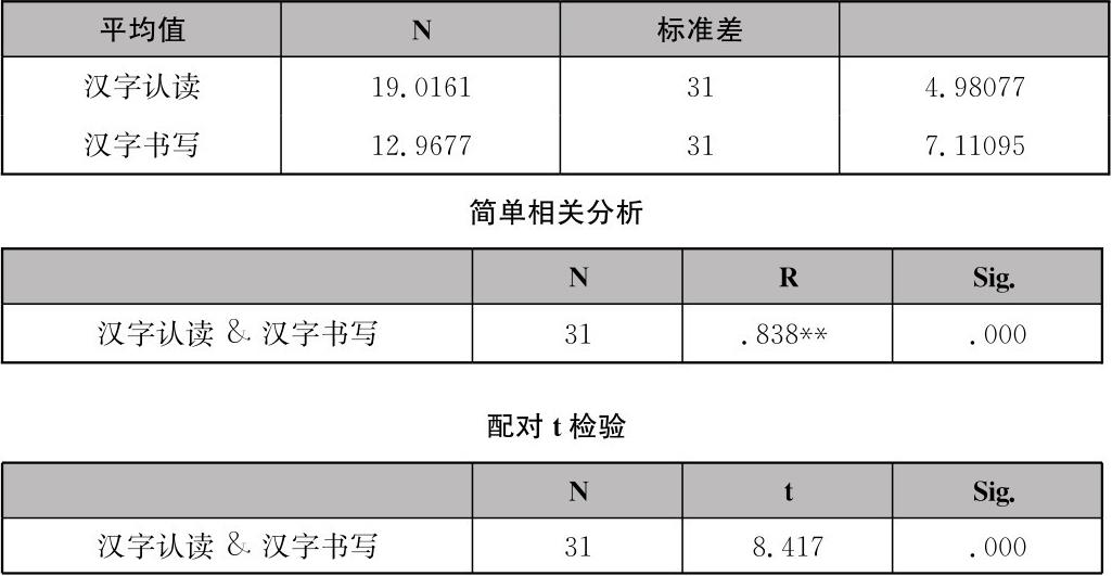 从上述结果可以看到,尽管汉字的认读和书写呈现高度相关(P=0.000),但两者习得效果的差异也达到了非常显著的水平(认读明显优于书写)。这就为我们接下来将两者分开进行相关性分析提供了依据。
