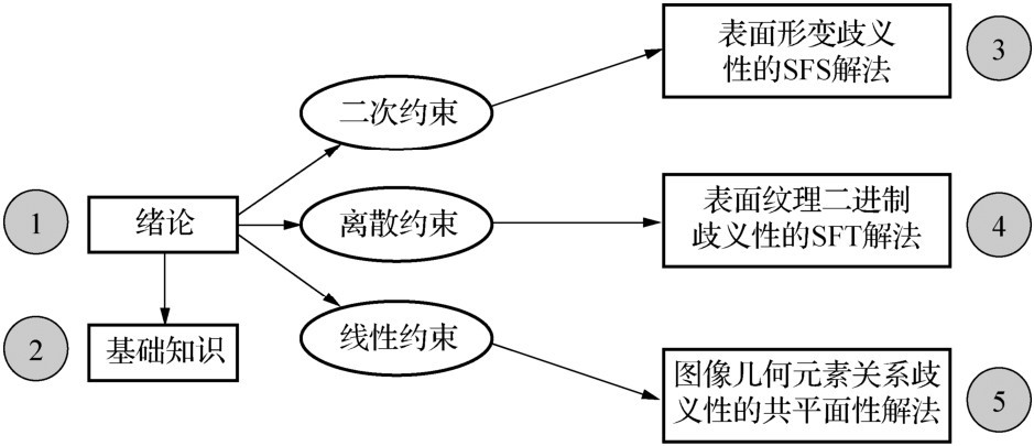 第1章,首先介绍计算机视觉的基本概念,接着讨论基于图像的3D表面重构的发展概况及数学原理,重点分析基于单幅图像的3D表面重构技术的非适定现象,最后简要总结了各种歧义性问题,并由此提出3种基本的约束模式。