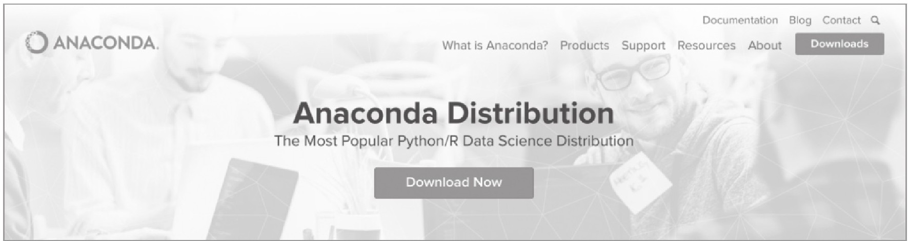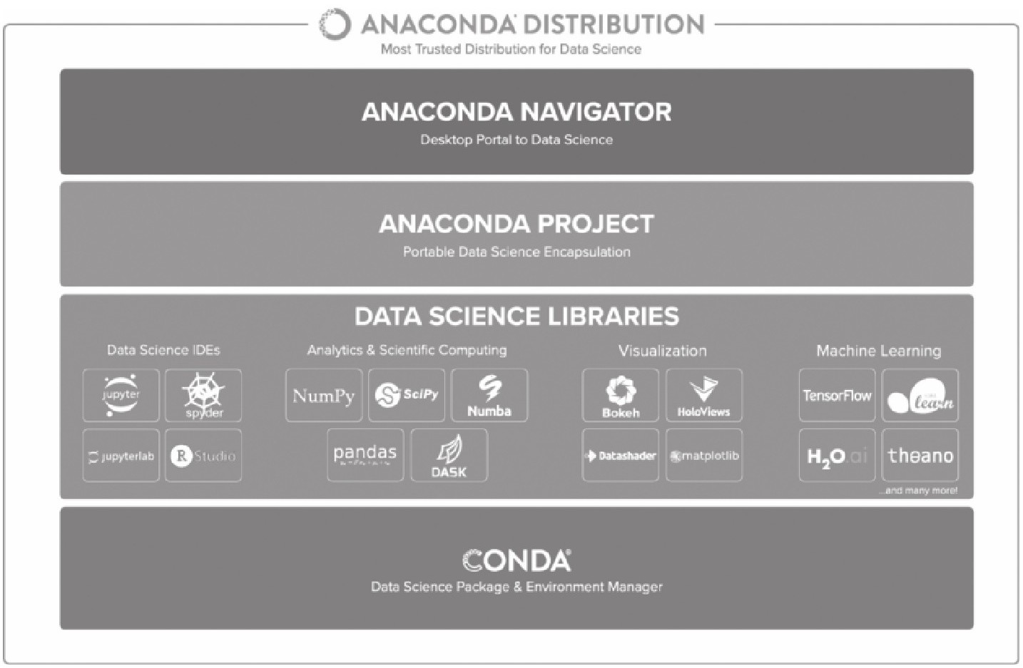 Anaconda号称是最受欢迎的Python语言和R语言数据分析工具,如图1-2-2所示。它通过对虚拟环境、工具包和Python版本的管理,大大简化了工作流程。同时,Anaconda也是适用于企业级大数据分析的Python工具。它所包含的多个数据科学相关的开源包广泛覆盖了数据可视化、机器学习和深度学习等多个方面,不仅可以用于数据分析,还可以用在大数据和人工智能领域。