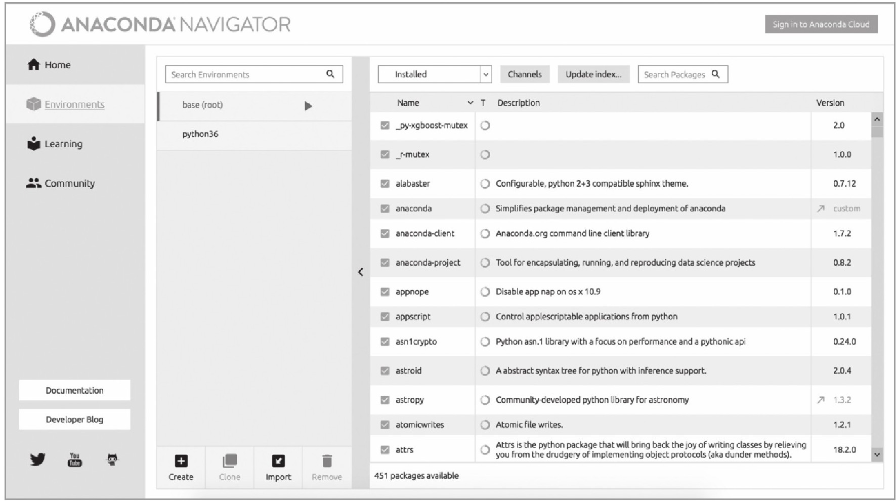 从图1-2-8中可以看出,Navigator对于环境管理和工具包的管理非常直观简洁,单击相应位置即可完成环境及工具包的搜索、创建、删除和更新等系列操作,因而在此不进行详细说明。