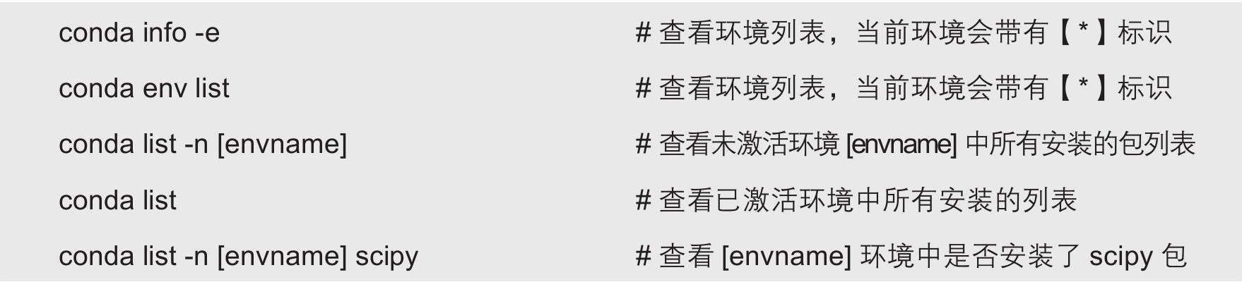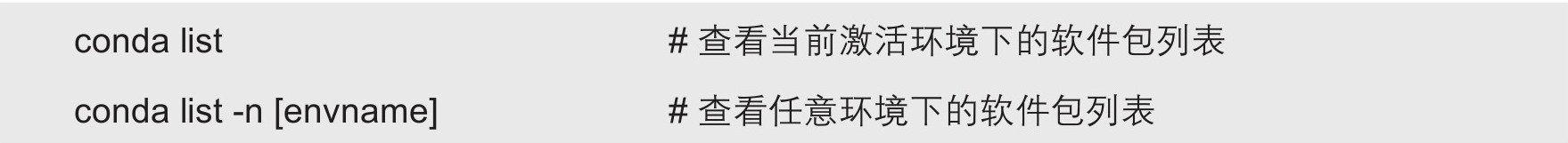 (3)查看已安装的软件包列表。通过以下方式可以查看不同环境下已安装的软件包列表。