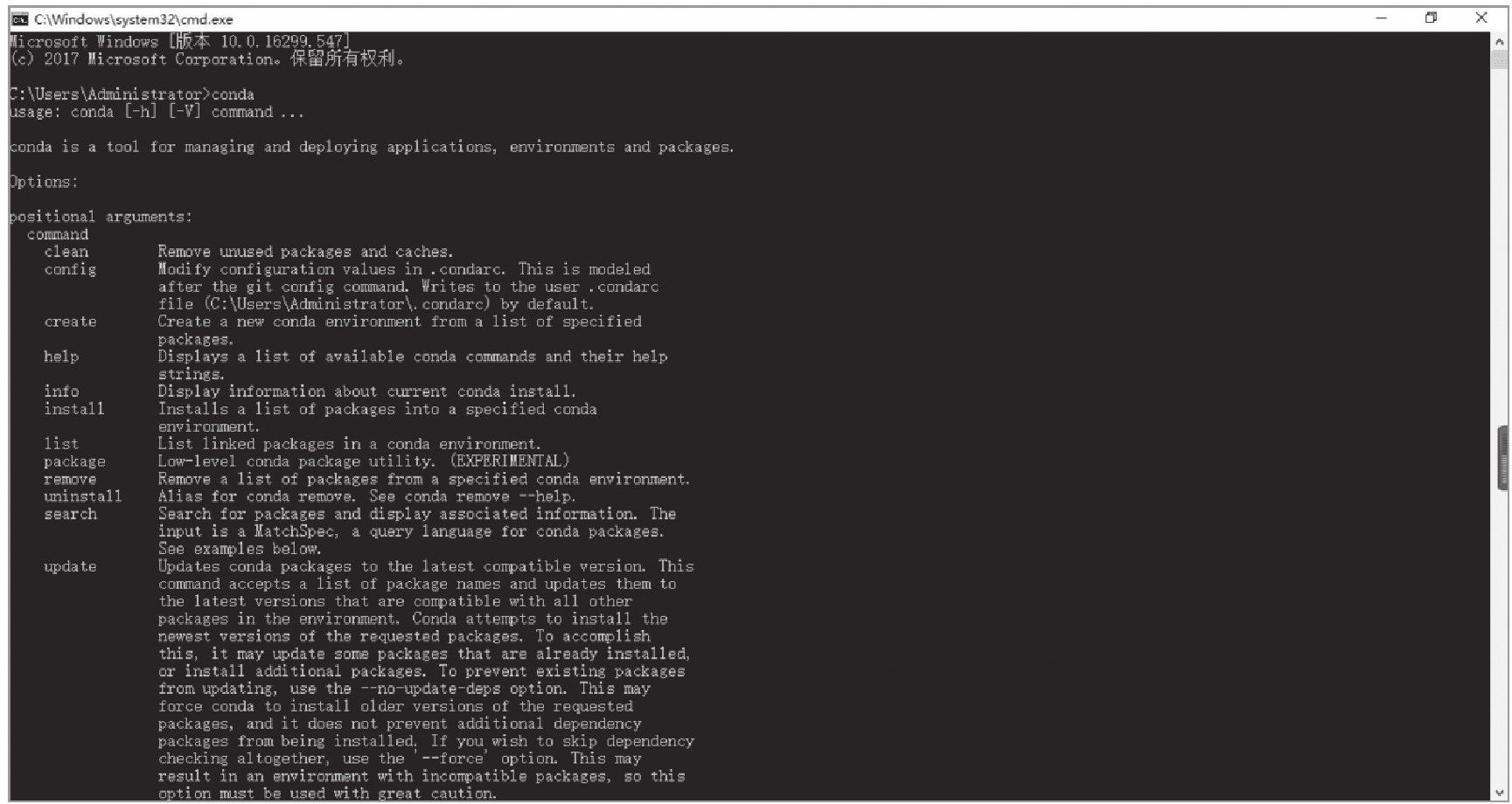安装完成后,打开CMD窗口,输入Conda命令测试安装结果,如图1-2-6所示即为安装成功。