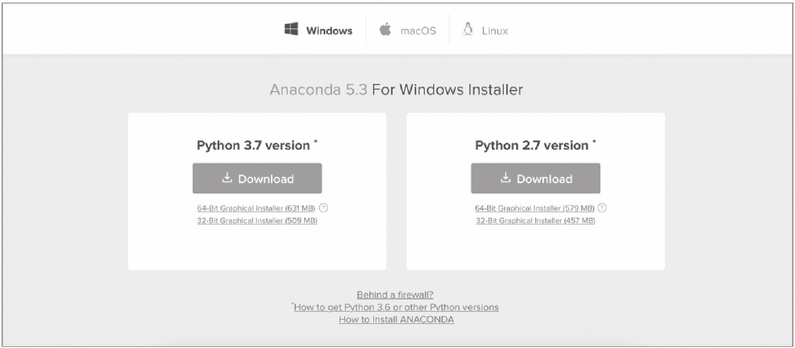 官网上提供了Windows、macOS和Linux三种系统下的Anaconda安装包,并且对每种系统都分别提供了与之相对应的Python 3.7和Python 2.7两个版本,如图1-2-3所示。此处推荐安装Python 3.7版本,因为官方已经宣布Python 2.7版本只会维护到2020年。其实安装哪个版本在本质上并没有太大的区别,因为通过环境管理,我们可以很方便地切换运行时的Python版本。