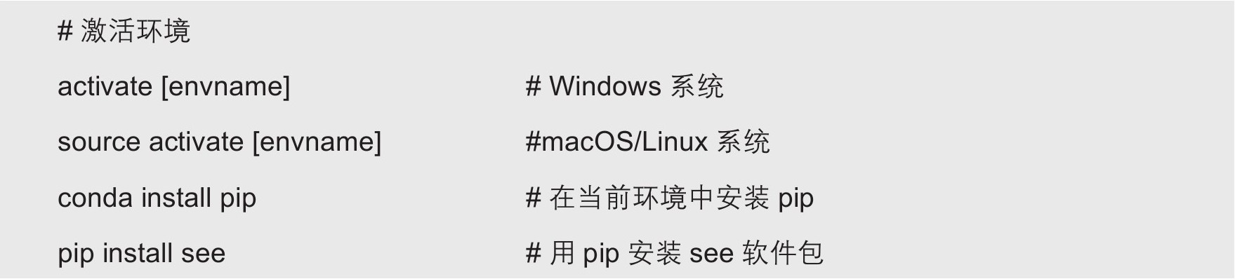 (2)安装非conda包。如果无法从Anaconda.org或清华TUNA镜像站获得软件包,则可以选择使用其他软件包管理器(如pip)查找并安装软件包。