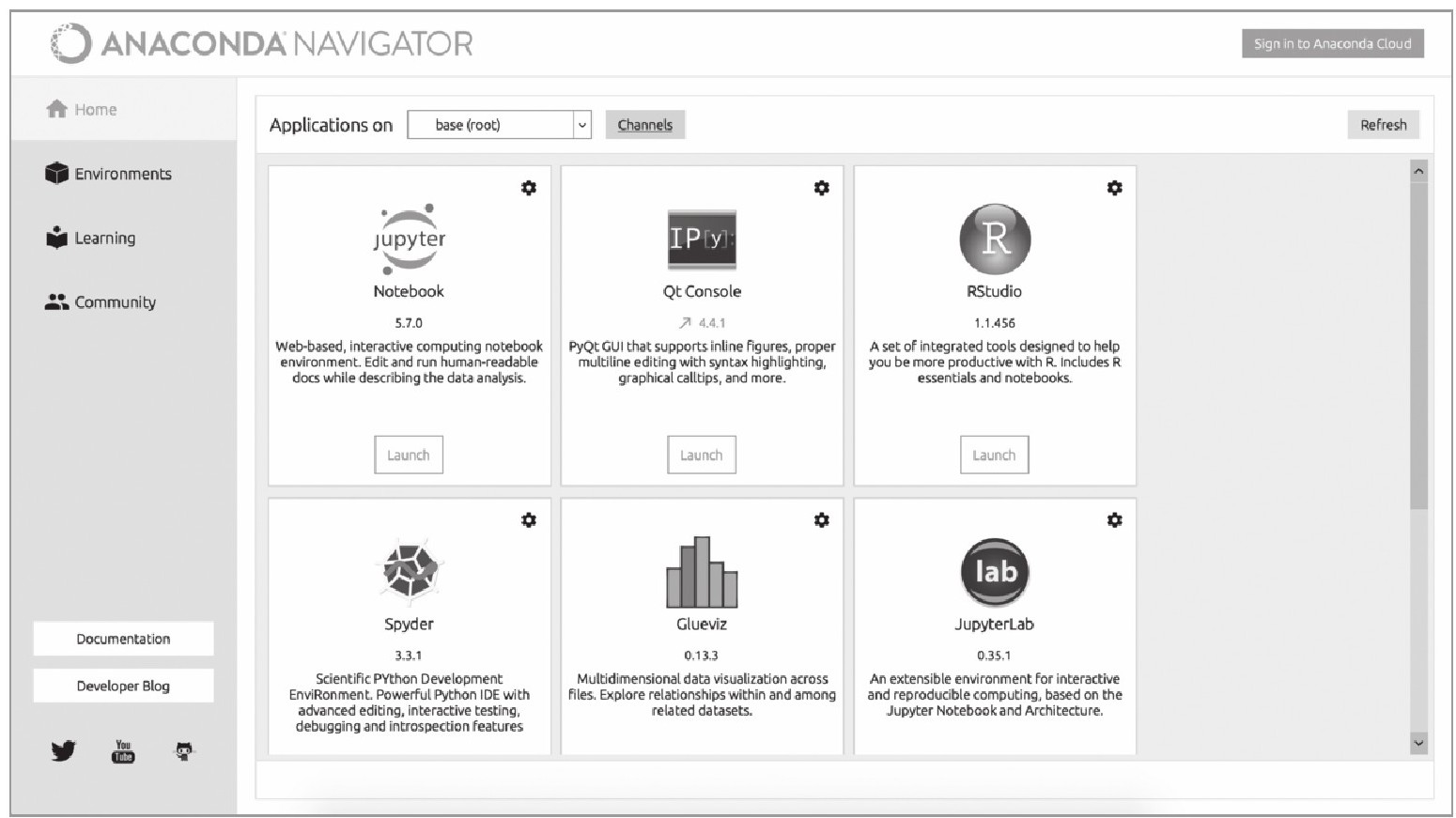 而上述提到的多个在Windows【开始】菜单中出现的应用,用户可以选择打开Anaconda Navigator,如图1-2-7所示,在其中单击进入,或者在终端中输入相应的应用名称即可打开应用。