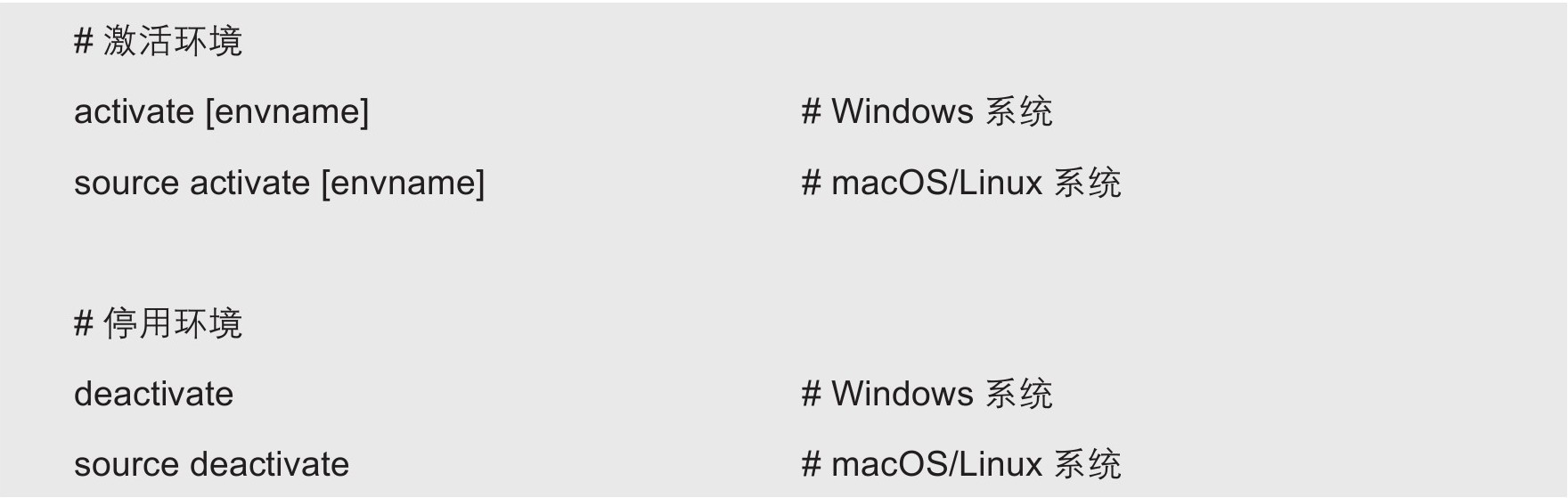 (3)激活/停用环境。通过对环境的激活和停用,可以实现不同环境之间的切换。在激活一个环境之前,最好先停用目前正在运行的环境。