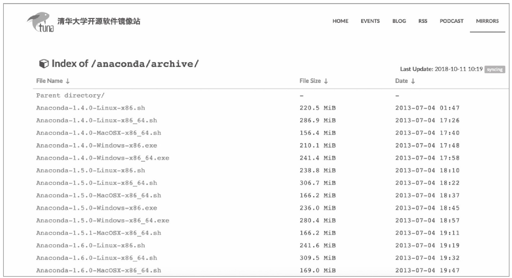 针对此种情况,清华大学开源软件镜像站提供了下载Anaconda的“新姿势”,如图1-2-4所示。我们可以在这里选择适合自己系统的Anaconda版本进行下载安装,与Anaconda官网相比,速度会提升不少。
