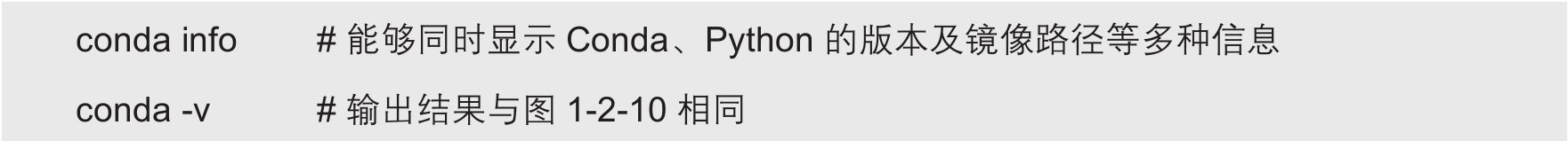 (2)查看Conda安装版本。除例1.2.1的代码可以用来查看Conda的版本外,以下代码也可以做到。
