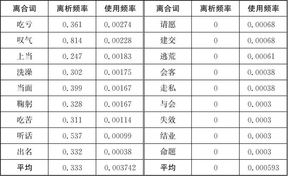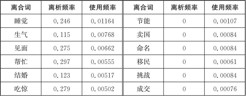 我们发现,离合词离析频率与其在语言中的使用频率有一定关系。大部分高离析频率离合词常常也是现实生活中高使用频率的词语,低离析频率离合词也常常是低使用频率离合词。请看下表[其中使用频率数据依据的是《现代汉语频率词典》(1986)]:
