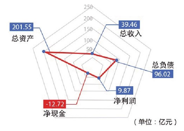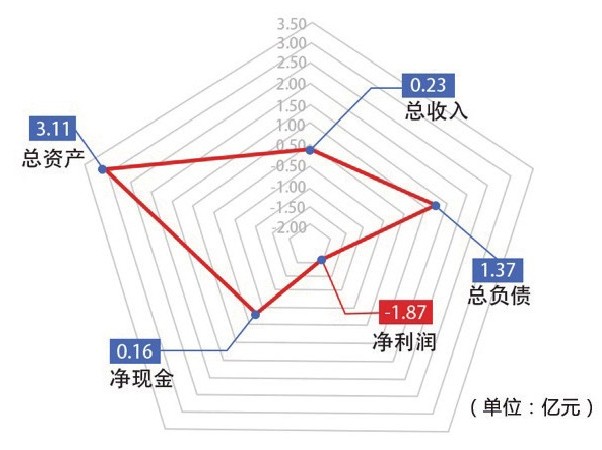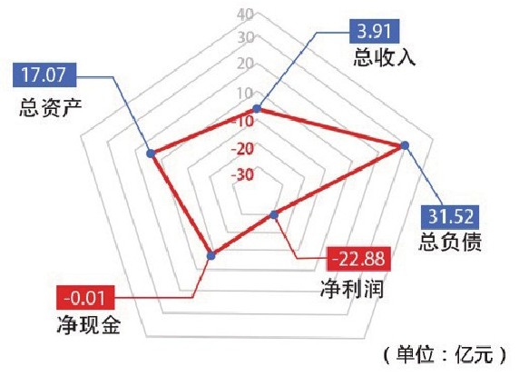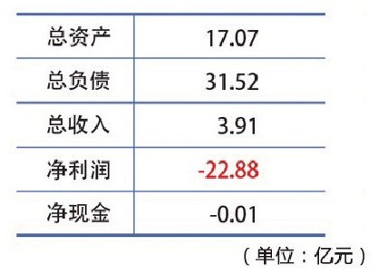 如图4-13和图4-14所示,Z公司总资产为17.07亿元,在上市公司里算规模不大的公司。总负债竟然高达31.52亿元,远远超出了总资产,负债率高达184.6%,由此算出公司的净资产是-14.45亿元,意味着经营者不仅没有赚到钱,反而把公司投资人的净资产全部亏空,还继续亏掉债权人的钱。再看收入规模,总收入仅3.91亿元,总资产周转率仅为0.23次/年,收入规模比较小。净利润就更恐怖了,一家总收入不到4亿元的公司净利润竟然亏损了22.88亿元,净利率为-585.3%,也就是说公司的日常经营就需要花掉20多亿元,而赚到的销售收入还不到4亿元,难怪亏空了投资人的钱。这家公司净现金流只有-0.01亿元,说明几乎没有流入也没有流出,全年现金总量几乎没有变化。