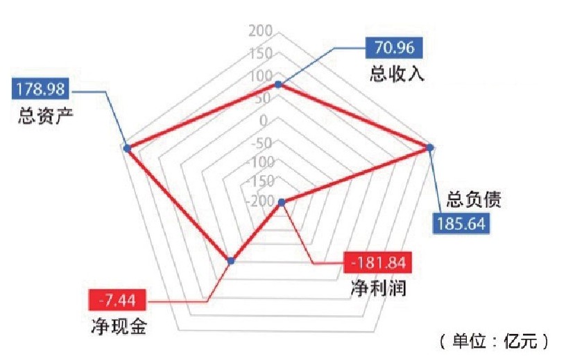 如图4-2所示,L公司总资产为178.98亿元,在上市公司中算规模比较大的;总负债高达185.64亿元,超出了总资产,这属于非常危险的状况。根据财务恒等式“资产=负债+所有者权益”,这里的所有者权益就是净资产。通过公式可以看到,L公司的净资产已是负数,也就是说,很有可能是常年亏损造成了“资不抵债”。再看总收入,为70.96亿元,还不到总资产的一半。净利润绝对值竟然比总收入还大,这个数字有点恐怖。再看净现金流,也是负数,为-7.44亿元,不过跟净利润相比还没那么恐怖。由此推测,L公司高额亏损的原因很可能是成本费用远远高出公司收入,而这些成本费用大多需要支付现金,这说明要么公司非常有钱,早早地把全部成本费用提前支付完还有剩余;要么就是公司拖欠这些成本费用,不给钱才出现了更少的支付。