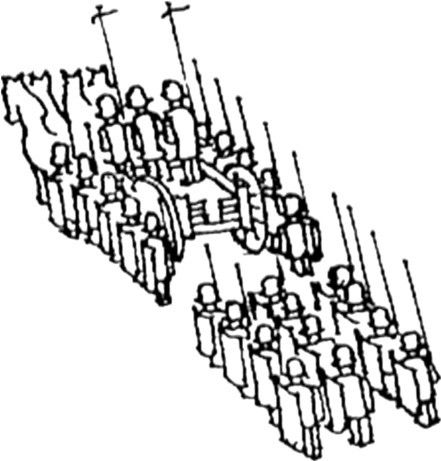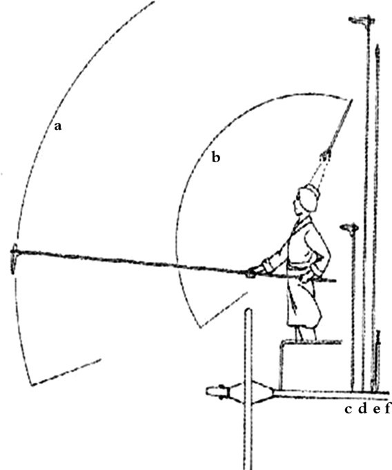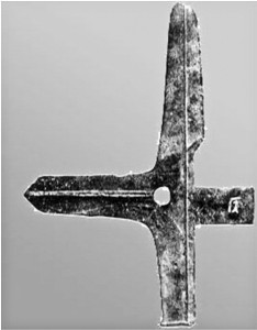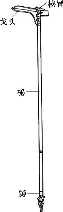 这时候的战车是单辕的,驾两匹马或是四匹马。据学者研究,要用单辕驾驭两匹马或四匹马是比较困难的。而且,在这个时代,战车相当昂贵,一个国家所能配备的战车数量也不是特别多。此外,这时候的士兵不是平民,而主要是贵族。这些因素都使得当时国家军队的数量不是很大。图2.7展示了战车的作战方式,一个战士站在车上,使用戈作为兵器,这也是当时最常见的一种兵器,其他的兵器还有矛、钺、斧、戟等。图2.8是一杆戈的示意图,可以看得更清楚,戈头加上杆大约有3米长。格斗的方式,主要是在战车相错的时候用戈的头啄击或者钩击。后来戈与矛相结合,就构成了戟(图2.9),戟在当时是一种更为先进的兵器。后来耳熟能详的小说《三国演义》里,吕布、典韦、太史慈都是用戟的。从先秦到三国时期所使用的戟,都是这种戈与矛的结合体。